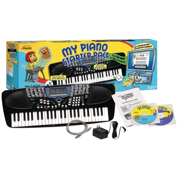 Made for kids, 49-key ||plug-n-play|| keyboard with speakers & USB cord provided; Full-motion videos that guide kids through songs and playing techniques; Specific interactive feedback on incorrectly played notes and rhythms; Interactive games that make learning fun; Songs that can be sped up or slowed down, so kids can learn at their own pace; Animated keyboard, digital recorder, metronome & over 100 software-based lessons; eMedia My Piano CD-ROM & DVD (for Win & Mac) covers basics such as proper hand & finger position, learning notes, counting rhythm, playing harmonies & reading music.; Keyboard features: 49 mid-size keys, built-in speakers, over 100 realistic sampled instrument sounds, USB port, LCD screen, 80 demo songs, 100 auto-accompaniment styles, 5 memory/drum pads, metronome, recorder, piano chord dictionary, DSP effects, transposition, 32-note polyphony, sustain feature, headphone jack, microphone jack, runs on 6 C batteries or the included AC adapter